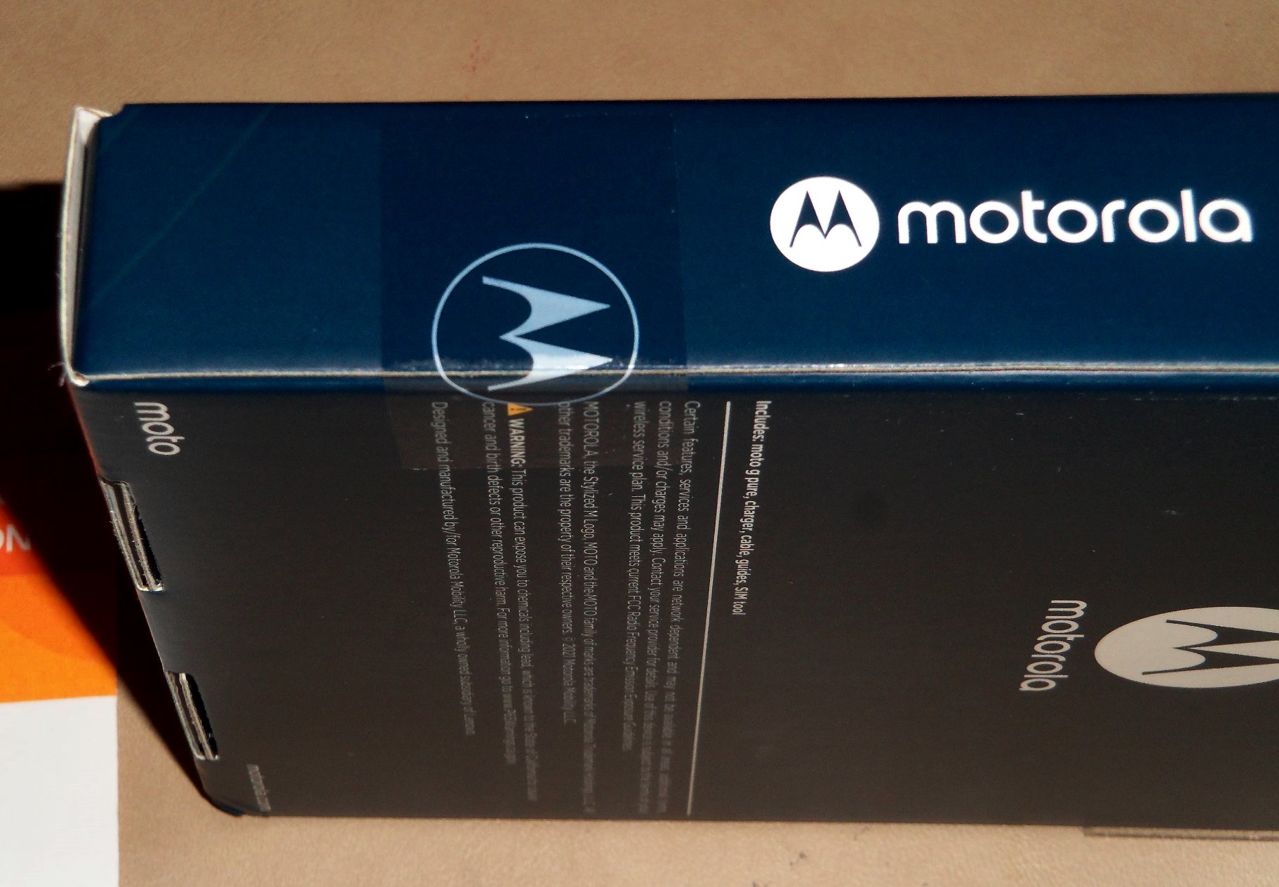 I like the Motorola box. It’s dark blue, with the name of the phone and the Motorola logo and name written on each side in white. Even the pieces of tape that secure the box’s flaps bear the fancy Motorola “M” on them. I hated that I had to cut across the tape to get to the phone.